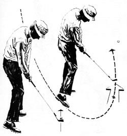 Mengambil dan kelab dan menganggap bahagian atas betul kedudukan swing. Sekarang, menjaga dipikul sepenuhnya bertukar, mula tangan kiri dan melengkapkan perlahan-lahan ke bawah ke bola. Bilakah di tangan kiri dan lengan telah berpindah ke bawah Kayuhan seramai kira-kira satu kaki ke lapan belas inci... BERHENTI... dan kembali ke atas semula. Ulangi gerakan menurun ini beberapa kali, mengekalkan bahu dalam kedudukan yang bertukar sepenuhnya.